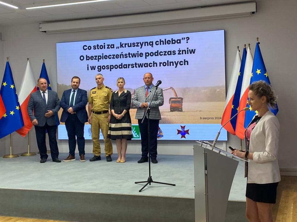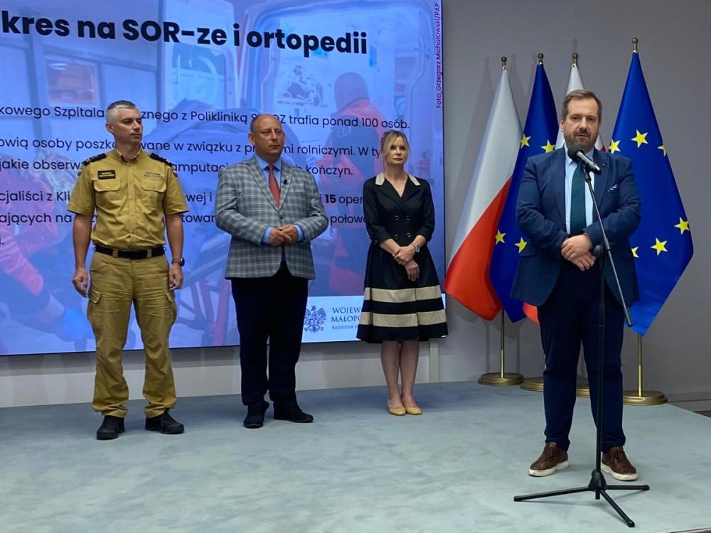 W briefingu prasowym w Małopolskim Urzędzie Wojewódzkim dotyczącym bezpieczeństwa rolników w czasie żniw i prac na polu udział wzięli: Uczestniczyli w nim: wojewoda małopolski Krzysztof Jan Klęczar, dyrektor Oddziału Regionalnego Kraków Kasy Rolniczego Ubezpieczenia Społecznego Iwona Szablińska, zastępca małopolskiego komendanta wojewódzkiego Państwowej Straży Pożarnej bryg. Marcin Głogowski, p.o. dyrektora 5 Wojskowego Szpitala Klinicznego z Polikliniką SPZOZ dr hab. n. med. Bartłomiej Guzik, prof. UJ oraz pełnomocnik wojewody małopolskiego do spraw rolnictwa Ryszard Jędruch.