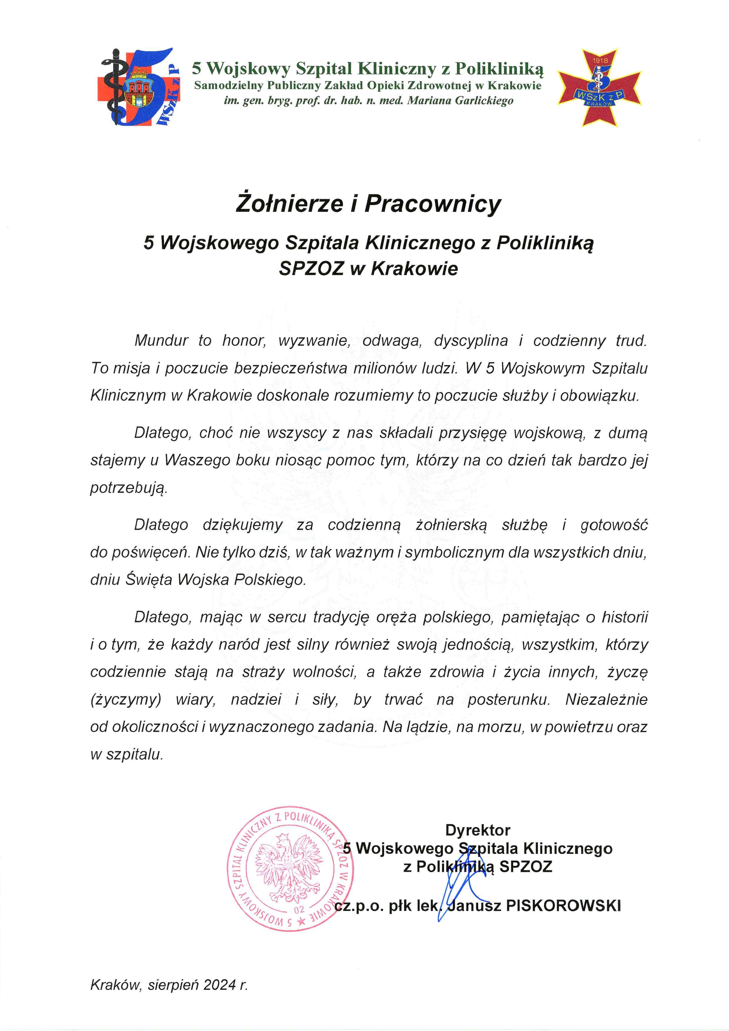 Uroczysty apel z okazji Święta Wojska Polskiego w 5 Wojskowym Szpitalu Klinicznym w Krakowie. Jak każe tradycja. I pamięć o tych, którzy nie zawahali się stanąć do walki o wolność, którzy stoją i zawsze stać będą na straży naszego bezpieczeństwa. Na lądzie, na morzu, w powietrzu, a także tu, w 5 Wojskowym Szpitalu przy ul. Wrocławskiej.