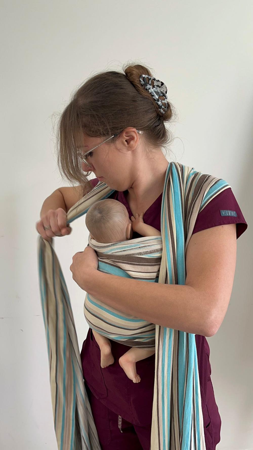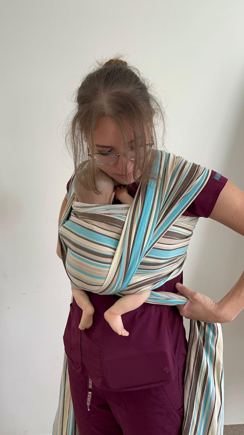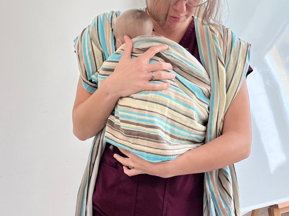 Chusty używane na zajęciach są naturalnej bawełny. Ich długość pozwala na noszenie dziecka zarówno na piersiach, jak i na plecach.