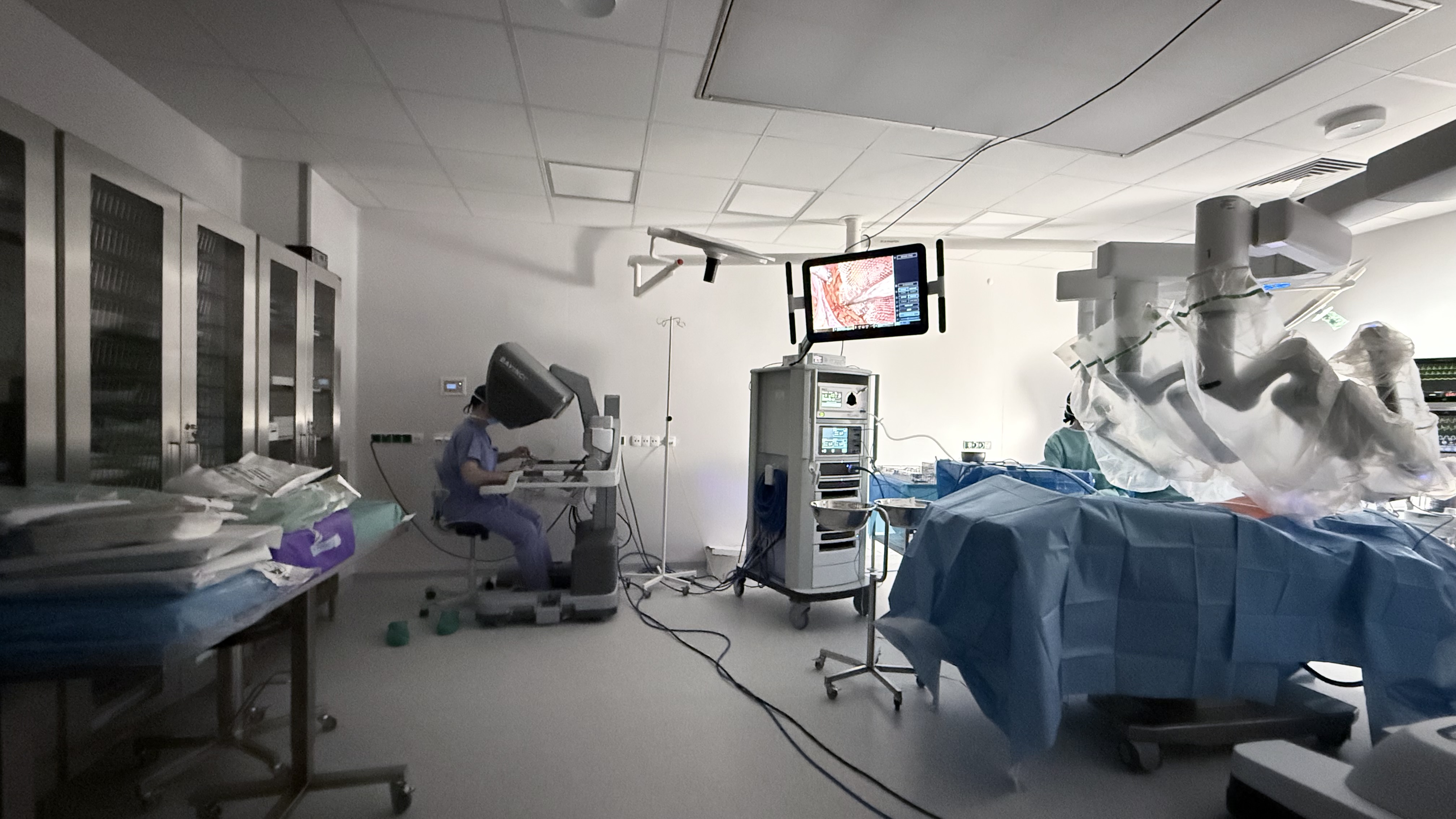Chociaż na sali jest więcej osób niż zazwyczaj – pierwsze operacje robotyczne budzą spore zainteresowanie także w szpitalu –  na bloku panuje ascetyczna atmosfera. Operowany pacjent leży na środku, przykryty niebieskimi prześcieradłami. Widać tylko niewielki kawałek brzucha, nad którym z lekkim szumem poruszają się ramiona robota. Słychać też charakterystyczne krótkie pikania. To system daje znak, że operacja jest w toku.