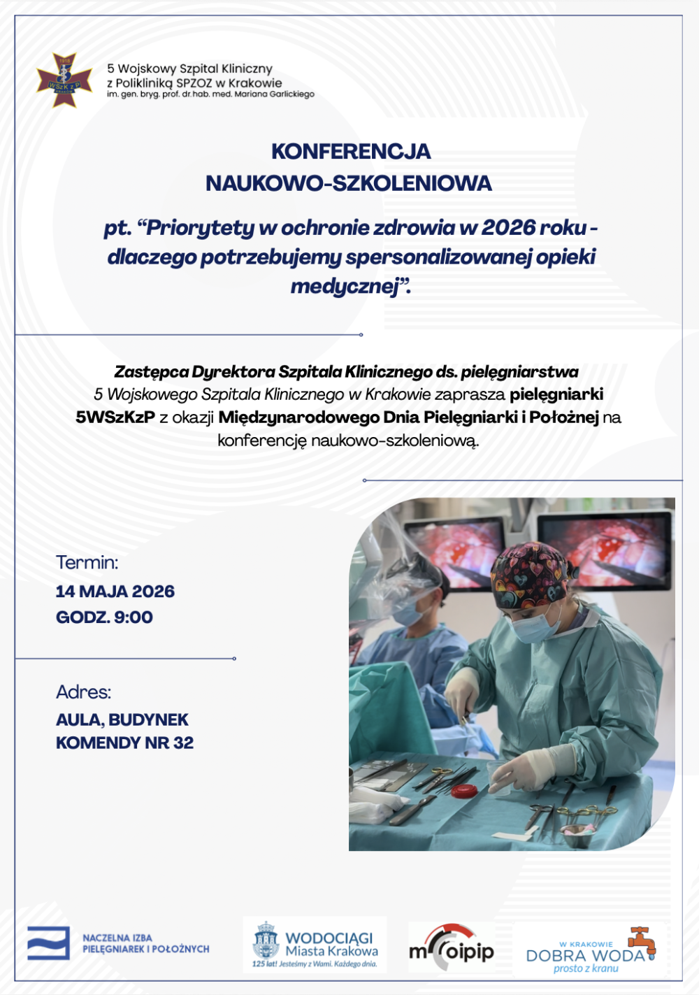 Już 14 maja 2026 r. spotykamy się w 5 Wojskowy Szpital Kliniczny z Polikliniką SP ZOZ w Krakowie na konferencji naukowo-szkoleniowej pt. „Priorytety w ochronie zdrowia w 2026 roku – dlaczego potrzebujemy spersonalizowanej opieki medycznej”.